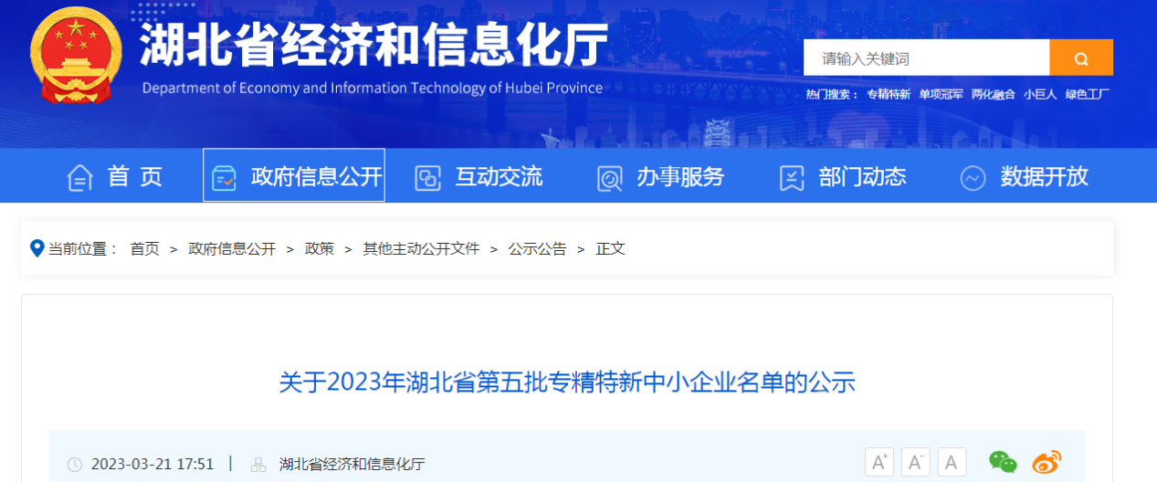 根據(jù)省經(jīng)信廳辦公室《關于開展第五批專精特新中小企業(yè)培育工作的通知》文件要求,2023年湖北省第五批專精特新中小企業(yè)名單已公示,全省此次入選企業(yè)共1803家,我司順利入選。