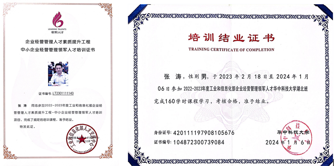 我司董事長兼總經(jīng)理張濤參加了2022~2023年度為期一年中小企業(yè)經(jīng)營管理領軍人才華中科技大學湖北班的培訓學習,并經(jīng)考核合格順利結業(yè)。