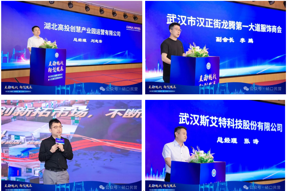 會(huì)上,高投創(chuàng)慧大健康產(chǎn)業(yè)園總經(jīng)理劉志云、武漢市龍騰第一大道服飾商會(huì)副會(huì)長(zhǎng)李鵬、武漢怡安居兔寶寶商貿(mào)有限公司總經(jīng)理丁瑤、武漢斯艾特科技股份有限公司董事長(zhǎng)張濤等四位優(yōu)秀民營(yíng)企業(yè)家代表作了經(jīng)驗(yàn)交流分享。