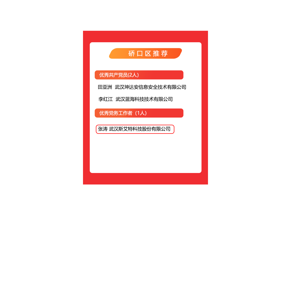2020年7月1日,武漢市委網(wǎng)信辦、市互聯(lián)網(wǎng)行業(yè)黨委發(fā)布了《通報表揚全市互聯(lián)網(wǎng)行業(yè)優(yōu)秀共產(chǎn)黨員和優(yōu)秀黨務工作者》的文章,對全市互聯(lián)網(wǎng)行業(yè)70名優(yōu)秀共產(chǎn)黨員和30名優(yōu)秀黨務工作者予以通報表揚。