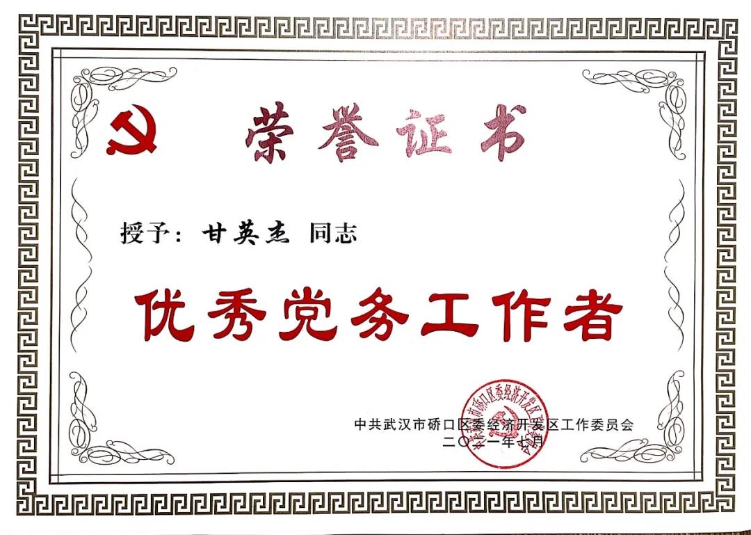 下午15時,大會正式開始,全體起立,共唱國歌。紀(jì)工委書記章國偉宣讀《硚口經(jīng)濟(jì)開發(fā)區(qū)黨工委關(guān)于表彰優(yōu)秀共產(chǎn)黨員、優(yōu)秀黨務(wù)工作者和先進(jìn)基層黨組織的決定》。20余名共產(chǎn)黨員、10余名黨務(wù)工作者、近10個基層黨組織,分別被授予硚口區(qū)委經(jīng)濟(jì)開發(fā)區(qū)“優(yōu)秀共產(chǎn)黨員”、“優(yōu)秀黨務(wù)工作者”、“先進(jìn)基層黨組織”榮譽(yù)稱號。開發(fā)區(qū)黨工委班子成員及其他領(lǐng)導(dǎo)為獲獎?wù)叽眍C發(fā)榮譽(yù)證書和獎牌,會場響起熱烈掌聲。我司支部張濤同志、趙俊同志分別榮獲“優(yōu)秀共產(chǎn)黨員”稱號;甘英杰同志榮獲“優(yōu)秀黨務(wù)工作者”稱號。